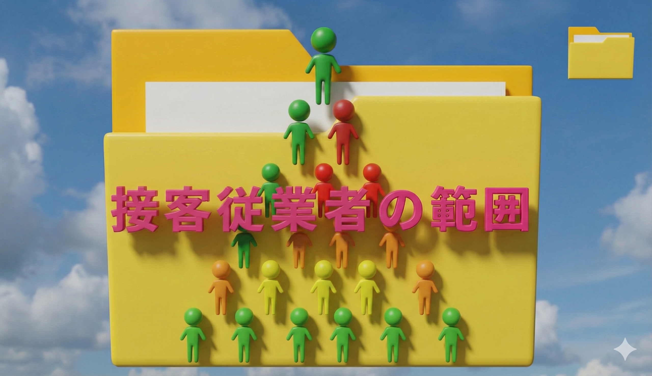 具体的には、風俗営業で「接待」を行う従業員、性風俗特殊営業で客に接する従業員はもちろん、「接待」に該当しないが、客から手荷物等を預かる者、客を客席まで案内する者、飲食物を提供する者、客から飲食代金を徴収する者も接客従業者に該当します。