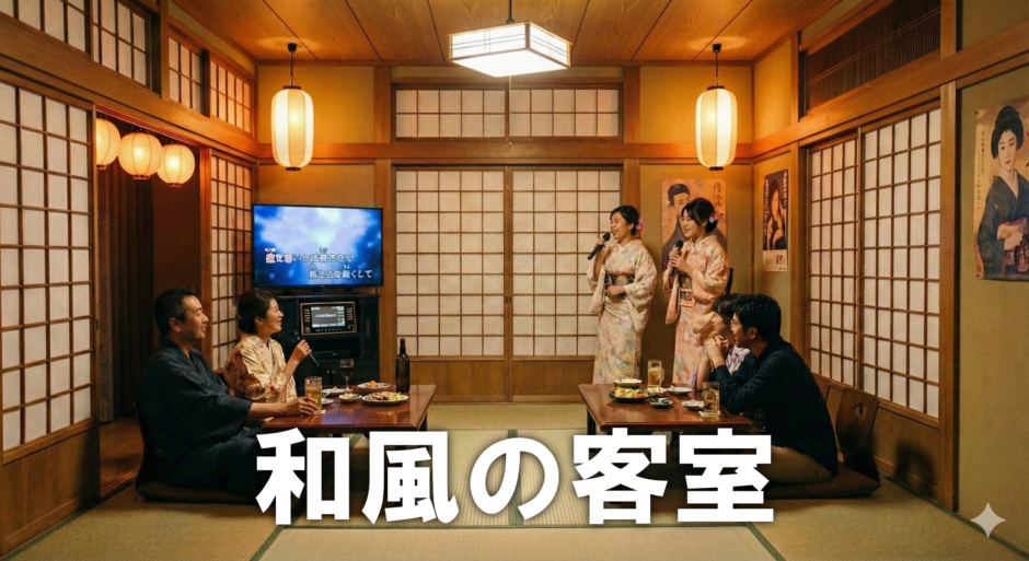 和風の客室とは、いわゆる料亭のような畳の客室をいいます。個室の客室で料理を食べながら接客を受けるスタイルです。和風の客室というためには、靴を脱いで、あぐらをかいたり、足を伸ばして床に座ることを想定しています。それぞれの客室の面積を9.5㎡以上にしなくてはいけません。